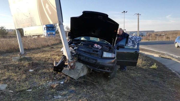 FOTO Șofer cu alcoolemie a intrat într-un panou publicitar la Șelimbăr