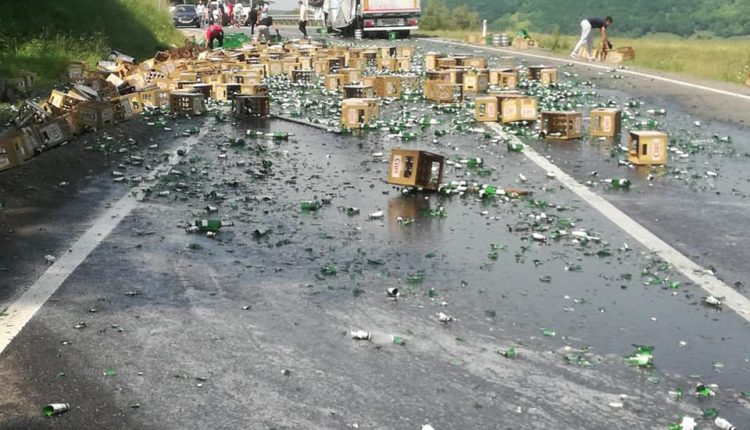 VIDEO FOTO Lăzi de bere împrăștiate pe șosea – S-a rupt prelata unui TIR
